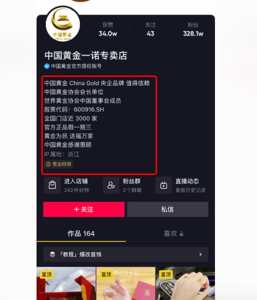 也就是说,抖音上大部分冠有中国黄金字号的账号都不是直营店铺,那些以剧本营销在抖音直播间内制造节目效果、低价出售所谓黄金饰品的商家或许是经销商。