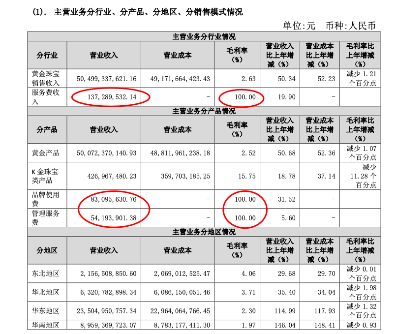 此外,中国黄金另一大利润来源为品牌使用费和管理服务费,两项费用收入分别约为8310万元和5419万元,并且毛利率为100%,二者合计毛利润超过1.3亿元。