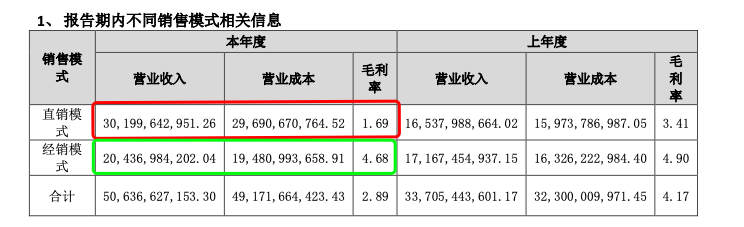 财报显示,报告期内直销模式营收约为302亿元,毛利率1.69%,经销模式营收约为204亿元,毛利率4.68%。