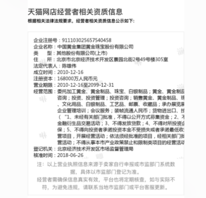 反观天猫中国黄金官方旗舰店,其背后公司才是真正的中国黄金集团黄金珠宝股份有限公司。