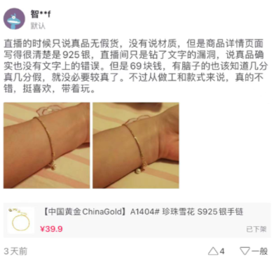 然而当消费者购买后才发现,这种低价的商品根本没有所谓的真金,不少消费者表示自己被套路了,直播间卖货有夸大的成分。