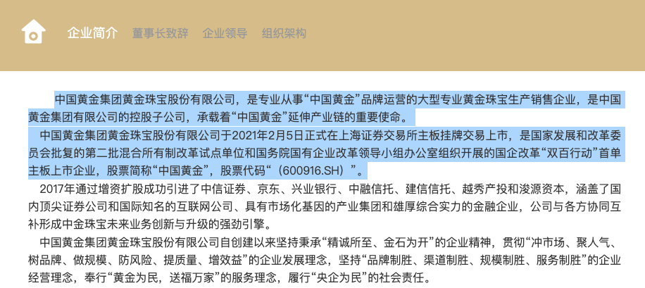 据官方资料显示,中国黄金为中国黄金集团旗下从事“中国黄金”品牌黄金珠宝产品研发、设计、生产、销售和品牌运营的大型黄金珠宝商。于2021年2月5日正式在上海证券交易所主板挂牌交易上市,股票简称“中国黄金”,股票代码“(600916.SH)”。