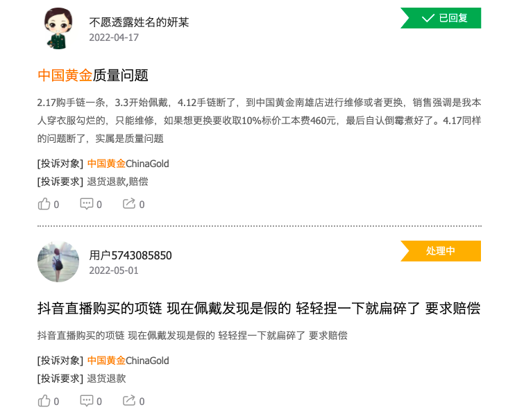 此外,在黑猫投诉平台上,有关中国黄金的投诉案例也多达1800条,有的消费者也是在抖音上购买,投诉内容大多为假货、质量差。