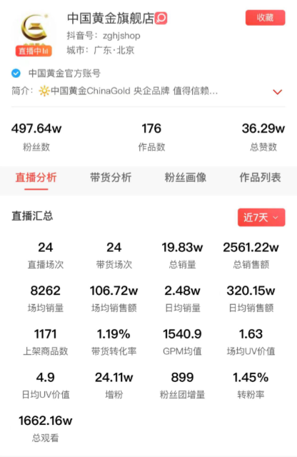 凭借一次次精湛的节目效果,中国黄金在抖音直播可谓是赚的盆满钵满。