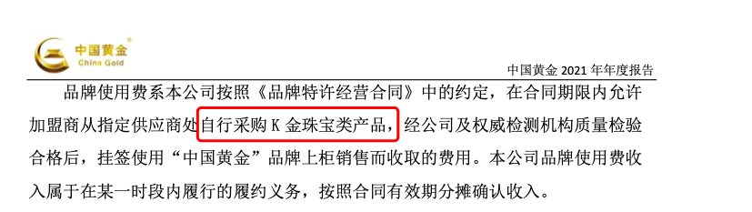 记者查询中国黄金的财报发现,在品牌使用费收入一栏,官方明确标注,在合同期限内允许加盟商从指定供应商处自行采购 K 金珠宝类产品,经公司及权威检测机构质量检验合格后,挂签使用“中国黄金”品牌上柜销售。