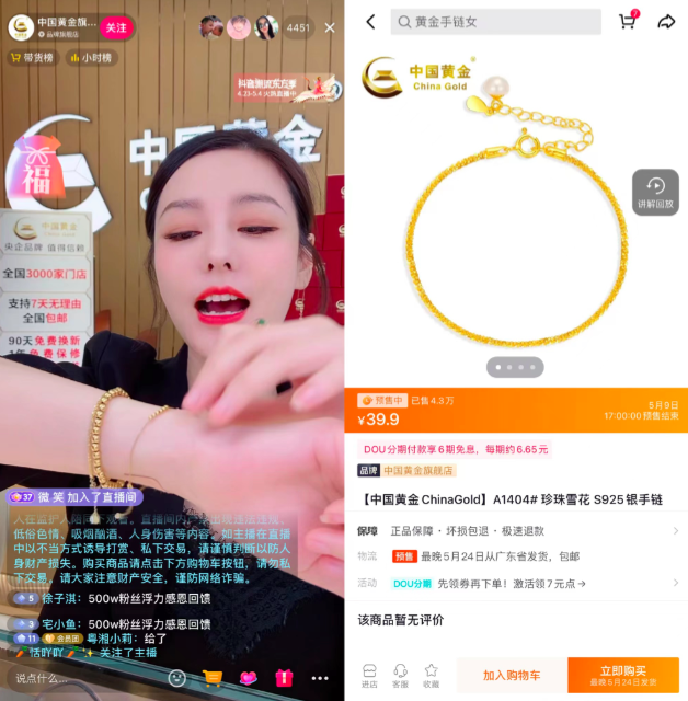直播间内,女主播不断吆喝着“中国黄金只要39块9”,评论区还不断刷屏着“500万粉丝福利感恩回馈”的弹幕,一套说词行云流水,观众甚至来不及问上一个问题。右下角的订单抢空后,女主播又接着介绍起下一款69块的“黄金”饰品……