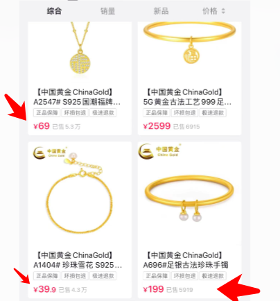 在抖音上,一些被中国黄金授权的店铺中随处可见39元、69元、99元等多种售价不足百元的首饰商品。值得注意的是,这些定价极低的商品在天猫中国黄金官方旗舰店内并无销售。